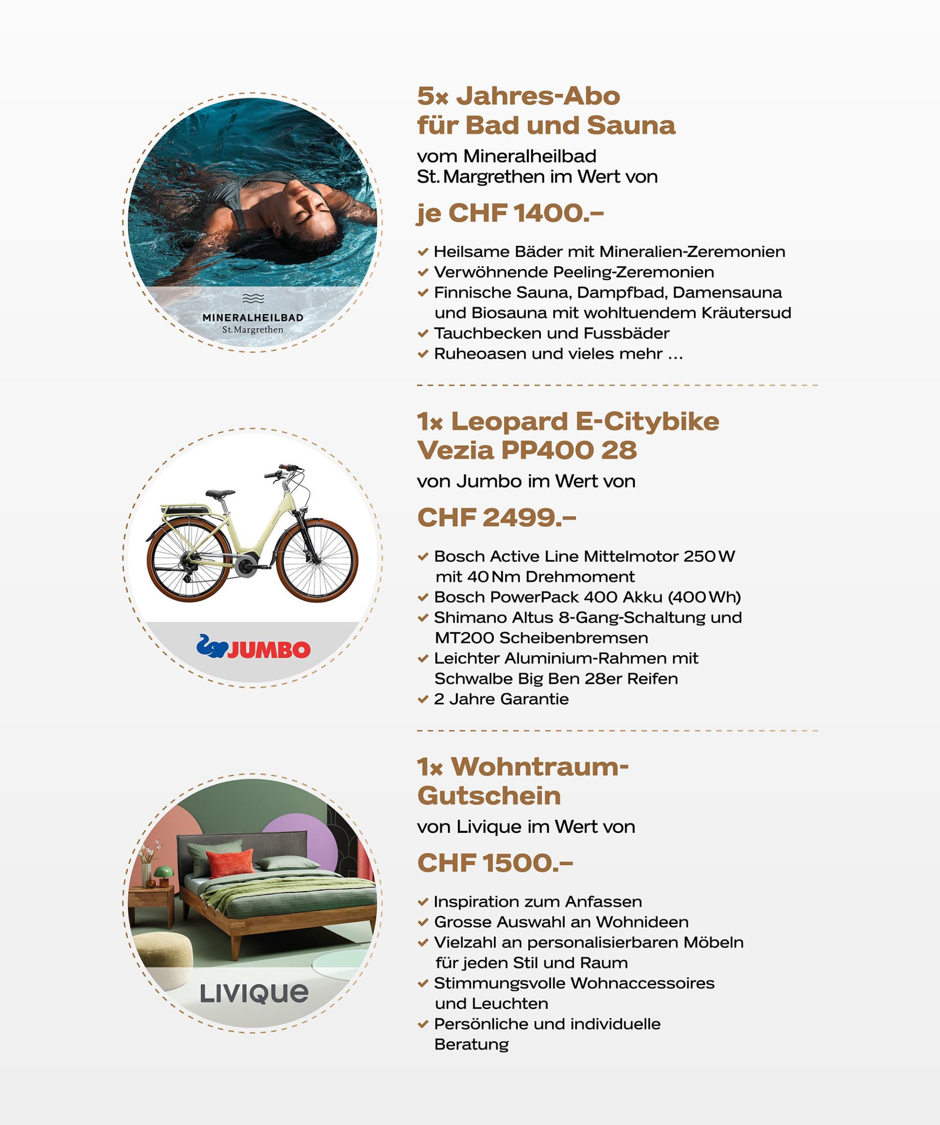Auf unsere glücklichen Gewinner:innen warten fünf Jahres-Abos für Bad und Sauna im Mineralheilbad St. Margrethen im Wert von je 1'400 Franken, ein Leopard E-Citybike Vezia PP400 28 von Jumbo im Wert von 2'499 Franken sowie ein Wohntraum-Gutschein von Livique im Wert von 1'500 Franken.